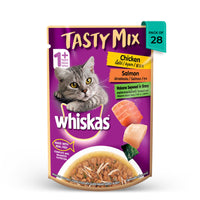 Whiskas Tasty Mix Chicken with Salmon Wakame Seaweed in Gravy is ideal for adult cats over 1 year.