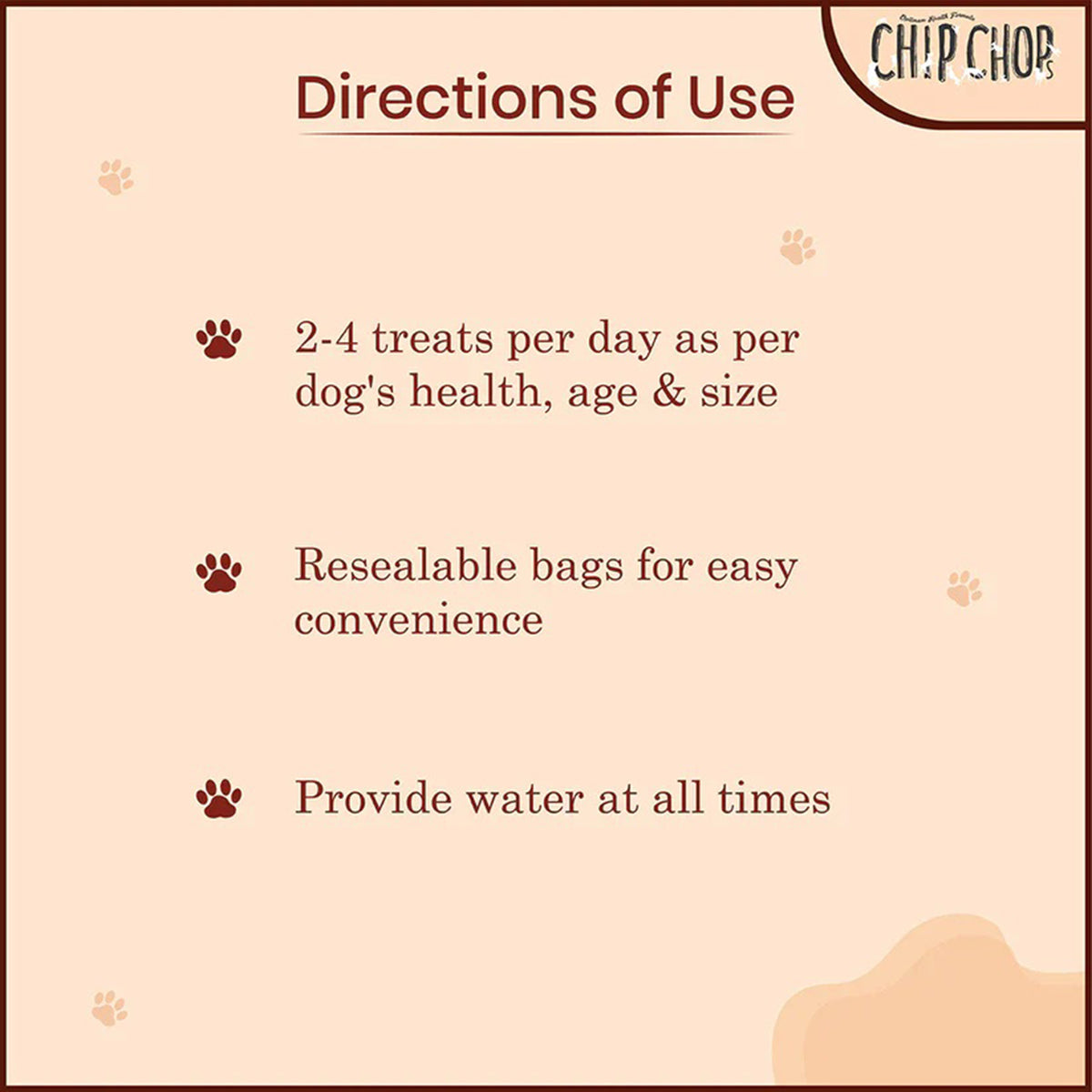 Store Chip Chops Roast Duck Strips in a cool, dry place away from direct sunlight. Ensure the bag is sealed tightly after each use to maintain freshness. Refrigeration is not necessary but can extend shelf life. Always supervise your dog while feeding treats and provide fresh water alongside.