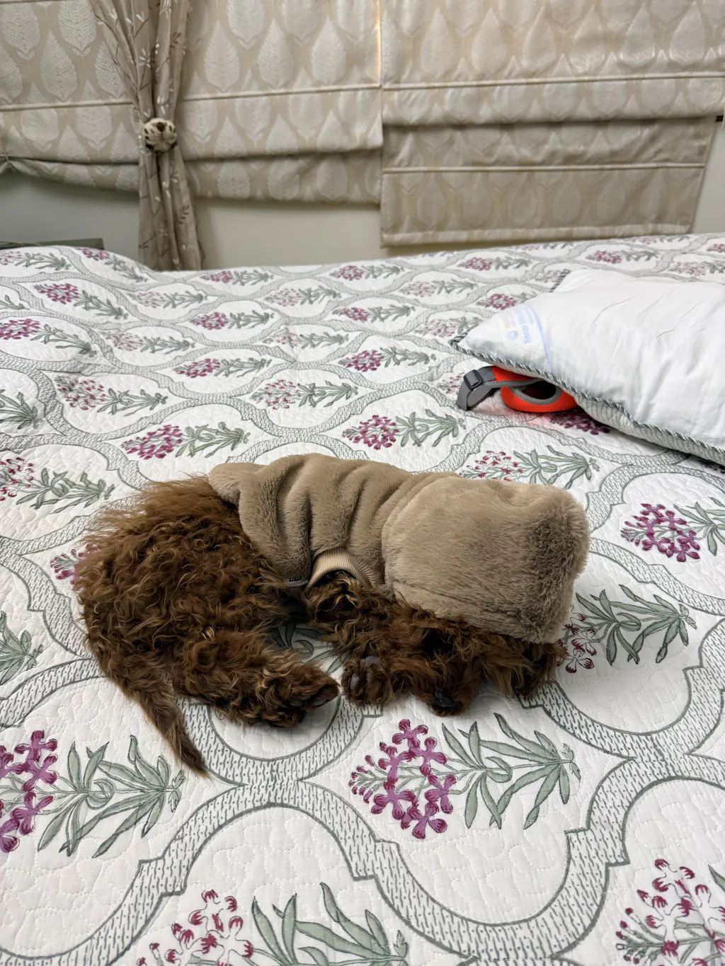 Cute small dog wearing a cozy brown hoodie sitting indoors, zigly style pet fashion
