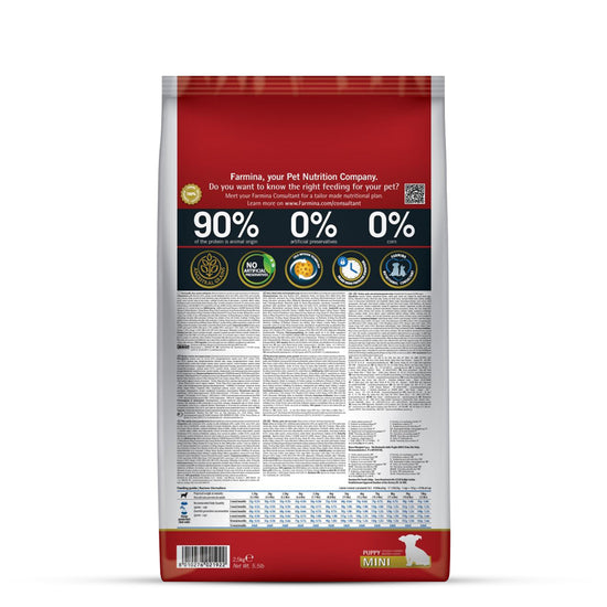 Farmina N&D Ancestral Grain Chicken & Pomegranate Mini Breed Puppy Food is tailored for small breed puppies for balanced nutrition growth.