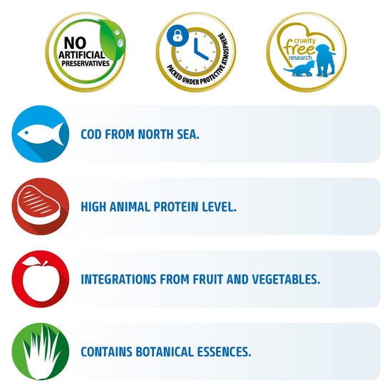 Cod (28%), Dehydrated cod protein (27%), Sweet potato, Fish oil (from herring), Dehydrated herring protein, Dried pumpkin (5%), Dehydrated shrimp (source of glucosamine and chondroitin sulphate), Pea fibre, Dried carrot, Alfalfa meal, Inulin, Fructo-oligosaccharides, Yeast extract (source of manno-oligo-saccharides), Dried cantaloupe melon (0.5%), Dried apple, Dried pomegranate, Dried spinach, Psyllium husks and seeds, Dried blueberry, Sodium chloride, Potassium chloride, Calcium carbonate, Dried brewers' yeast, Turmeric (0.2%), Aloe vera extract.