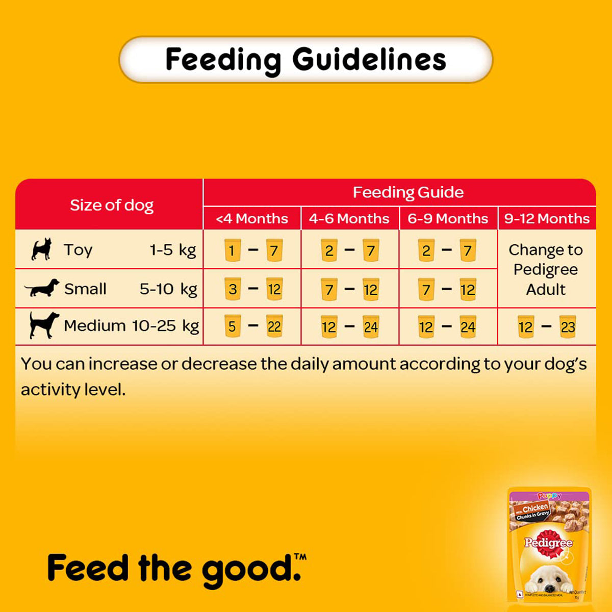 Make every mealtime a perfect blend of taste and nutrition for your puppy with Pedigree. Pedigree Puppy Wet Dog Food, Chicken Chunks in Gravy, offers a delicious and nourishing meal that keeps your puppy happy and supports their overall well-being. This flavorful dish is packed with tender chicken chunks in rich gravy, making it irresistible to your furry friend. Formulated with essential nutrients, it provides complete and balanced nutrition to help your puppy grow strong and healthy. High-quality protein and calcium support muscle and bone development, while DHA aids brain and vision growth. Vitamin E and Selenium contribute to a robust natural defense system. The meals high moisture content ensures optimal hydration. At Pedigree, all recipes are developed based on research from the Waltham Centre for Pet Nutrition and adhere to the NRC 2006 guidelines set by the U.S. National Academy of Science. Treat your puppy to the wholesome goodness of Pedigree for a tasty and nourishing mealtime experience.