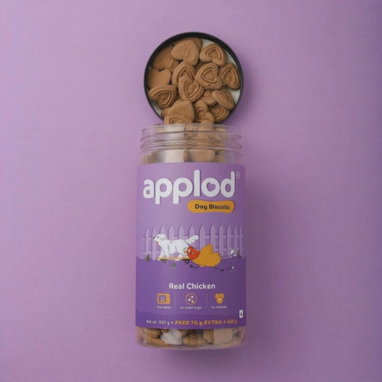 Baked with love by, our team of nutritionists, who care as much about your pet as you do, these biscuits are made with ethically and responsibly sourced ingredients to ensure the highest quality and safety standards. Made with real chicken as the number one ingredient, Applod Real Chicken Dog Biscuits provide a protein-rich punch to fuel your dog's active lifestyle.